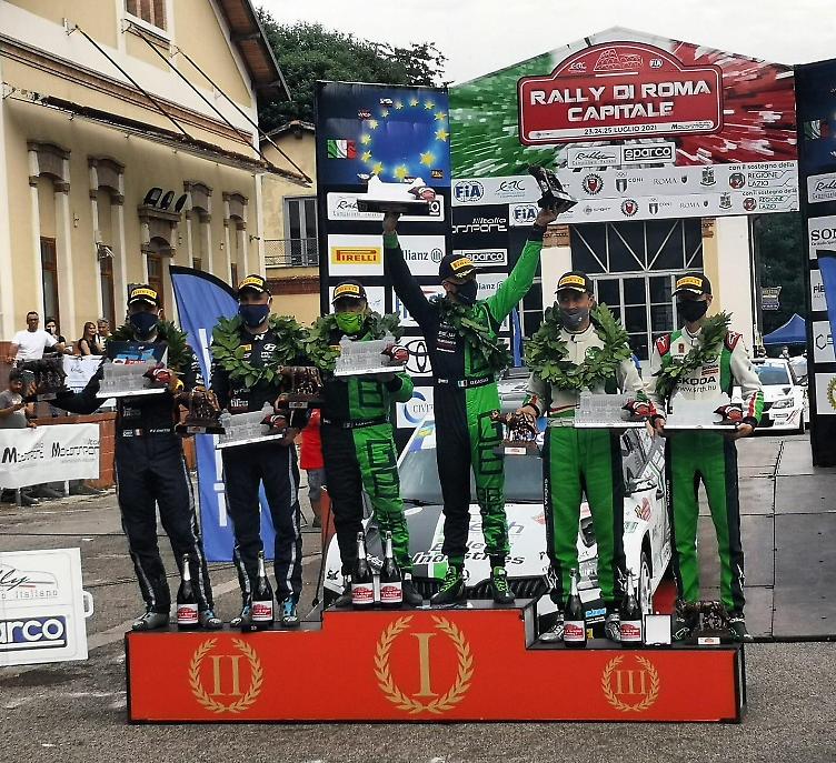 Giandomenico Basso vince il Rally di Roma Capitale 2021! Il pilota trevigiano conferma l'affermazione dopo la SS13. Sul podio di Fiuggi i festeggiamenti.Secondo posto di Andrea Crugnola, terzo per Herczig Norbert. Sul podio anche Fabio Andolfi. Il pilota di Savona, sesto assoluto, ha chiuso terzo nella classifica del Campionato Italiano Rally Sparco che lo vede ora primo inseguitore di Basso in campionato.