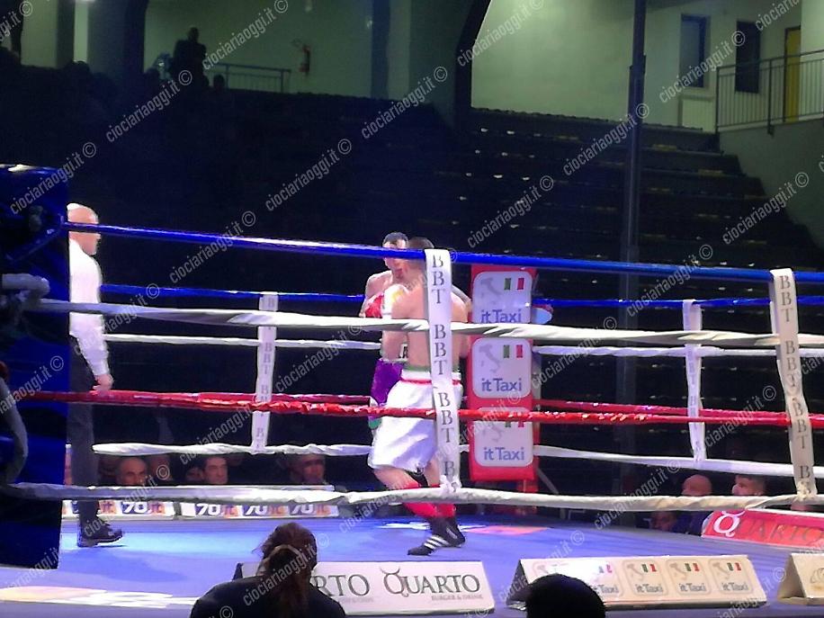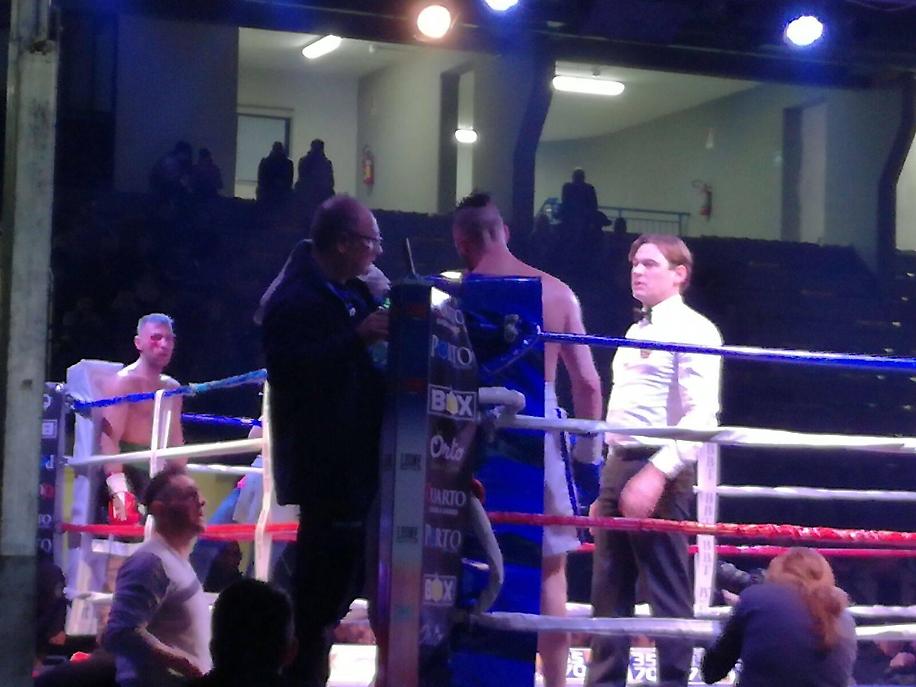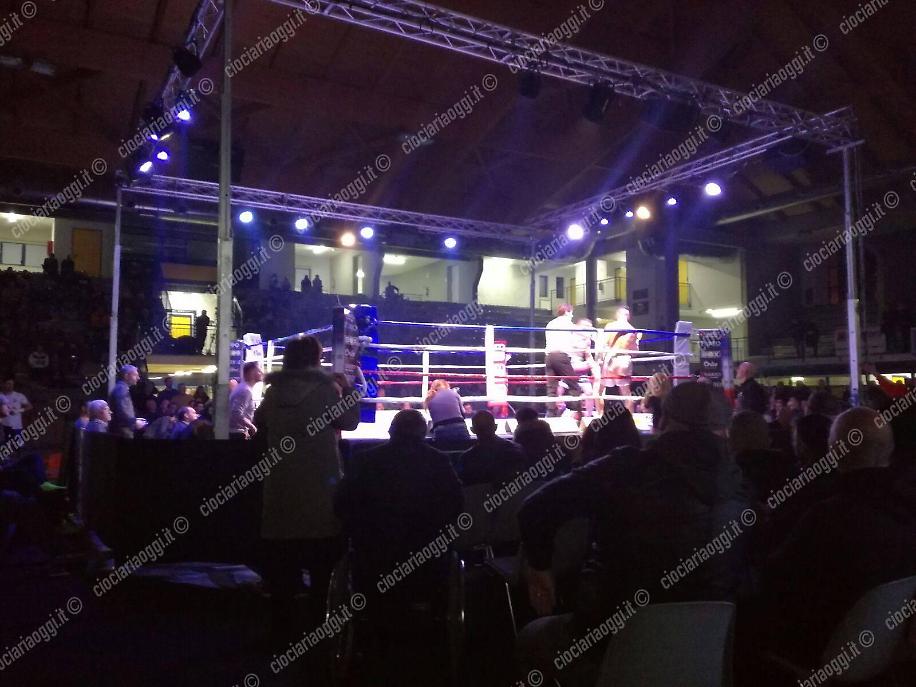 E' in corso al Palasport di Frosinone la grande notte della boxe. Bordo ring gremito, cosi come le tribune e le curve. Sette gli incontri professionistici in programma, i primi appena conlusi. Nella categoria Pesi Welter. l'incontro tra Daniele Giaguaro Iacovissi di Frosinone e Federico Cerelli di Ceccano ha visto prevalere ai punti il rappresentante della città fabraterna,