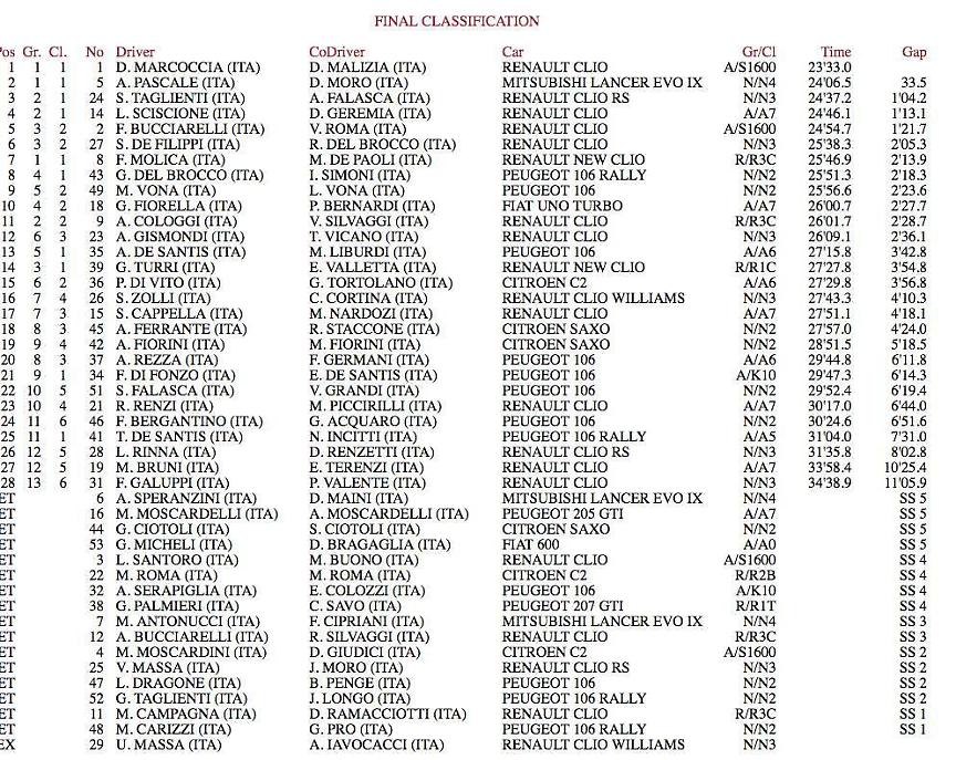 Dopo la ps 1, Valerio Cologgi di 5,3 km, in testa c'erano Taglienti e Falasca con un solo secondo su Marcoccia-Malizia; nella seconda ps l'equipaggio sulla S1600 balzava avanti rifilando 2,7 secondi a Speranzini-Maini; Pascale-Moro si aggiudicavano la terza prova speciale, poi l'equipaggio recente vincitore in Ciociaria con il n.1 sulle fiancate, risaliva prepotentemente nelle ultime due ps.
