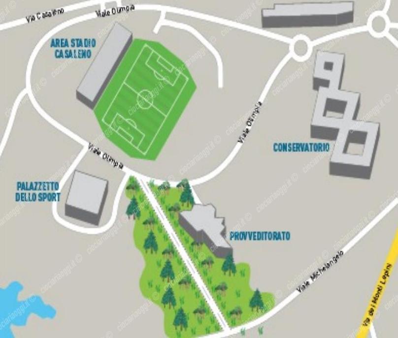 La strada di collegamento tra viale Michelangelo e viale Olimpia, in caso di chiusura positiva dell'iter autorizzativo, ricalcherà il tracciato originario. Sarà lunga circa 300 metri e occuperà una superficie di 2.000 metri quadrati con un tracciato rettilineo che consente: il puntuale controllo della tifoseria ospite coi consueti mezzi a disposizione per le forze dell'ordine; l'innesto con viale Michelangelo con sbocco quanto più vicino ai punti di arrivo a Frosinone (autostrada e stazione ferroviaria); l'innesto su viale Olimpia quanto più vicino all'area del palazzetto dello sport, individuata quale zona dedicata a parcheggio dei mezzi (pullman) di trasporto della tifoseria ospite (tale soluzione attiene a scelte operate con lungo processo decisionale/partecipativo all'interno dell'intervento di completamento dello stadio Casaleno, con la Prefettura, la Questura, ecc.), onde rendere quanto più possibile breve il percorso di eventuale contrapposizione delle due tifoserie; limitazione dei costi; migliore fruibilità in relazione alle strutture "a servizi" presenti e previste nell'area e alla disponibilità dei terreni e minor impatto sui luoghi per come attualmente conformati sotto il profilo orografico, ambientale e paesaggistico.