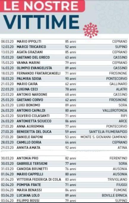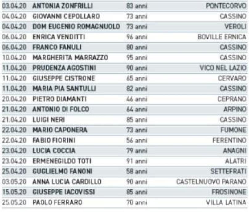 E ancora l'abate di Casamari, il farmacista di Villa Latina, il professore di Frosinone in pensione, il finanziere a riposo di Cassino, l'imprenditore tornato dall'Irlanda in Valcomino, le coppie di Ceprano e Ausonia. Tanta gente comune, commercianti, imprenditori, casalinghe, pensionati. Persone alle quali non c'è stato il tempo di dire addio, di un ultimo abbraccio, di un'ultima telefonata. Di mettere un fiore, un rosario o un ricordo nella bara.