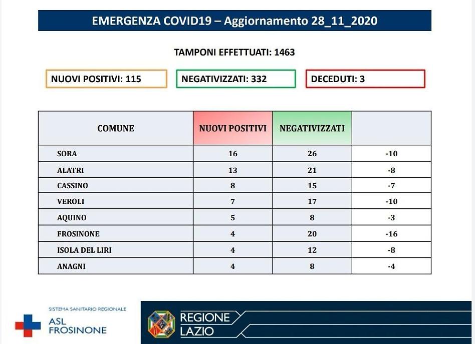 Il maggior numero di nuovi positivi si registra a Sora con 16 casi. Seguono Alatri con 13, Cassino con 8, Veroli con 7, Aquino con 5, Frosinone, Isola del Liri e Anagni tutte e tre con 4.