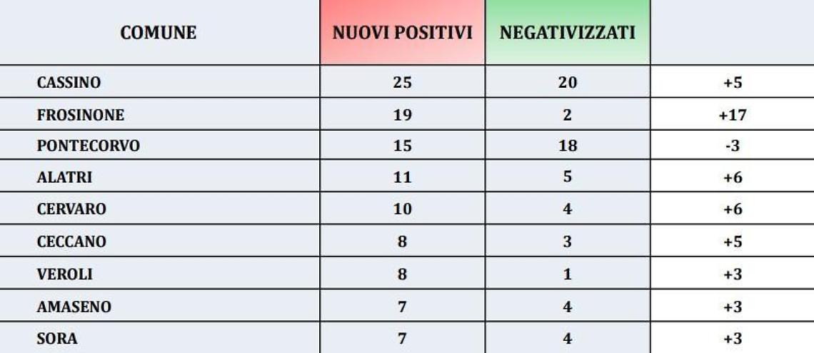 Il maggior numero di nuovi contagi si registra a Cassino con 25 nuovi positivi. 19 a Frosinone, 15 a Pontecorvo, 11 ad Alatri e 10 a Cervaro. 8 nuovi casi sia a Ceccano che a Veroli, 7 ad Amaseno e altrettanti a Sora.