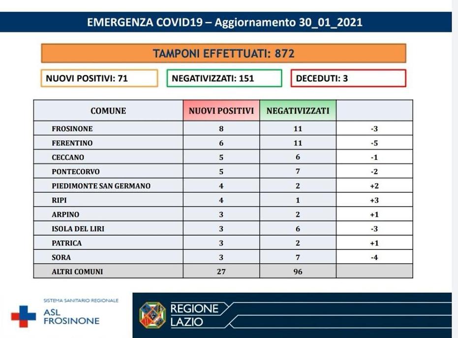 Sono 71 i nuovi positivi al Covid in Ciociaria, a fronte di 872 tamponi eseguiti. Secondo il bollettino diramato dalla Asl, nella provincia di Frosinone sono poi 151 i negativizzati. Si contano, purtroppo, altre 3 vittime.