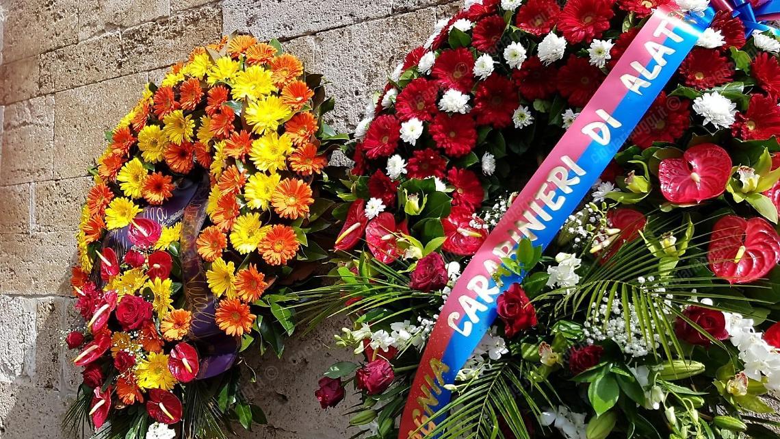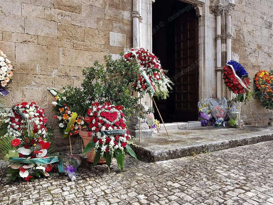 Tante corone di fiori all'ingresso della chiesa Santa Maria Maggiore a Ferentino. Diversi i colleghi che hanno voluto essere presenti oggi pomeriggio per l'ultimo saluto al comandante della stazione carabinieri di Guarcino, il maresciallo Massimo Paris.