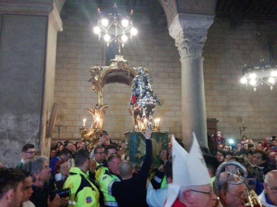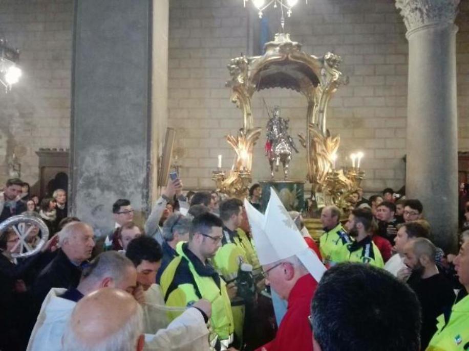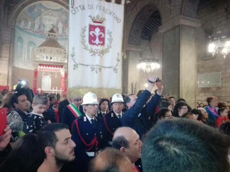 È stata la vera festa di tutta una città, una grande comunità che si è stretta attorno al suo santo protettore, Sant'Ambrogio martire. Tantissime persone hanno riempito la cattedrale ieri sera per la la reposizione della statua dopo la celebrazione della Messa presieduta dal vescovo diocesano Ambrogio Spreafico. La festa del 1 maggio a Ferentino è un evento millenario, che nel far rivivere le storiche cerimonie, civili e religiose, emoziona tutti coloro che vi partecipano. E così è stato anche quest'anno. Migliaia di persone, molte giunte anche dai paesi limitrofi, si sono ritrovate ai piedi del soldato a cavallo per affidargli le preghiere e ringraziarlo per le grazie ricevute. Per tanti ferentinati il 1° maggio è anche occasione per tornare a Ferentino e rivivere con profonda fede e autentica commozione questa festa imponente, come fosse la prima volta: la vera festa di tutta una città.