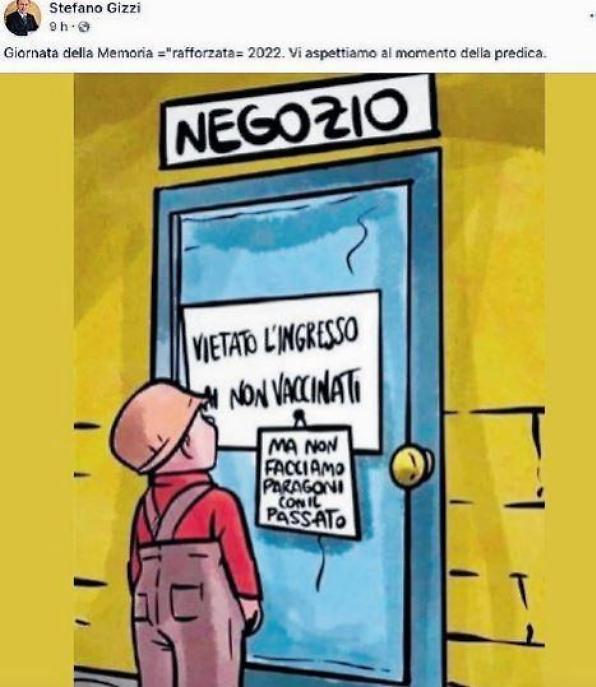 Pertanto, pretende «una presa di posizione di tutti gli esponenti politici locali e seri provvedimenti da parte della Giunta». Immediata ed altrettanto dura la replica di Stefano Gizzi: «Totalmente assenti per mesi e mesi senza che diano alcun contributo nelle vicende amministrative dichiara l'assessore i componenti di "Progresso Fabraterno" oggi speculano senza onore su una tragica e terribile vicenda, cercando di trascinarmi nel loro modo inaccettabile e scorretto di intendere le cose. Anche un bambino di cinque anni capisce bene che il mio accostamento non è in diretta correlazione con lo sterminio degli ebrei. Ma sono convinto che fra le vergognose discriminazioni di oggi nei confronti dei non vaccinati e la prima ondata di discriminazioni nei confronti degli ebrei negli anni Trenta vi sia lo stesso clima di intolleranza e prepotenza. Ho condiviso una vignetta amara, ma assolutamente rispettosa del dramma vissuto dal popolo ebraico. Al contrario, è meschina e mistificatrice la solita polemica dei "giovani vecchi" di Progresso Fabraterno, che travisano i miei intendimenti per le loro piccole motivazioni politiche».