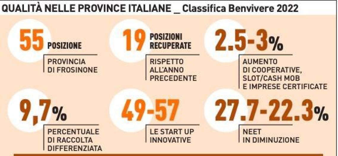 Pubblicata ieri dal quotidiano "Avvenire", nell'inserto speciale "Benvivere nei territori", la classifica sulla generatività in atto nelle province e nei comuni italiani. La situazione migliora quasi ovunque e le distanze tra le province si accorciano. La Ciociaria non fa eccezione ed è, anzi, tra quelle che segnano un miglioramento più marcato nella qualità della vita, con una variazione percentuale di 3.11 punti rispetto all'anno precedente. La provincia di Frosinone, infatti, fa un balzo in avanti di ben diciannove posizioni rispetto al 2021, passando da ottantunesima a cinquantacinquesima su centosette.