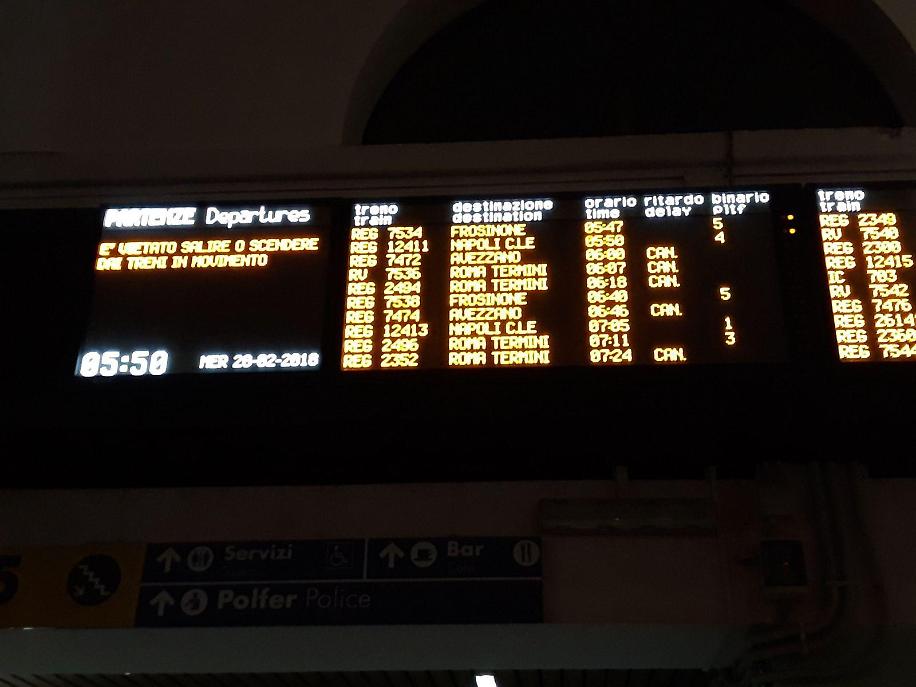 E non è mancata l'ironia come chi ha notato che «i treni in Canada viaggiano con tre metri di neve, in Italia cinque centimetri e tutto è bloccato». Tanta anche la rassegnazione: «A questo punto non conviene svegliarsi di notte per poi rimanere a gelare sui treni e non arrivare comunque a destinazione». Il 50% dei treni di ieri è stato soppresso. Oggi la percentuale scenderà al 30%. Ma i pendolari continuano a protestare per i disagi che sono costretti a subire Almeno fino alla comparsa del soDalla Roma-Cassino Express fanno sapere che «stamattina (ieri, ndr) ci sono stati i disagi maggiori: su sei treni ne sono partiti solo 2, quelli delle 3.38 e 7.11 da Cassino. Gli altri sono stati tutti soppressi. Nel pomeriggio c'erano un treno sì e uno no, anche se la linea sembrava reggere. Il problema sarà anche domani (oggi, ndr). Rispetto a trent'anni fa, però, gli scambi sono senza sistemi termici, per questo quando congelano si bloccano. Il problema è questo». Il comitato Salviamo la ferrovia Avezzano-Roccasecca minaccia dirivolgersi all'Autorità di regolazione dei trasporti e all'autorità giudiziaria nel caso anche oggi si arrivi alla cancellazione di tuti i treni della tratta. Nuovi espisodi questa stessa mattina: alle 7.49, i pendolari della tratta Roma-Cassino, fermi a Zagarolo, hanno lamentato il sovraffollamento del convoglio, descrivendo sui social la situazione come drammatica: addirittura l'equivalente dei passeggeri di 3 o 4 treni ammucchiati in un unico mezzo. Continuano i disagi.