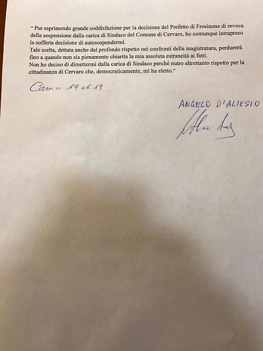 Alla fine ha deciso di autosospendersi nelle more degli avanzamenti della magistratura e fiducioso nel suo operato. Il sindaco di Cervaro Angelo D'Alesio - difeso dagli avvocati Sandro Salera e Paolo Marandola - ha appena assunto questa decisione, precisando però che non si dimetterà da sindaco perché nutre rispetto per la cittadinanza di Cervaro che democraticamente lo ha eletto. La sua autosospensione durerà "fino a quando non sia pienamente chiarita la sua estraneità ai fatti".