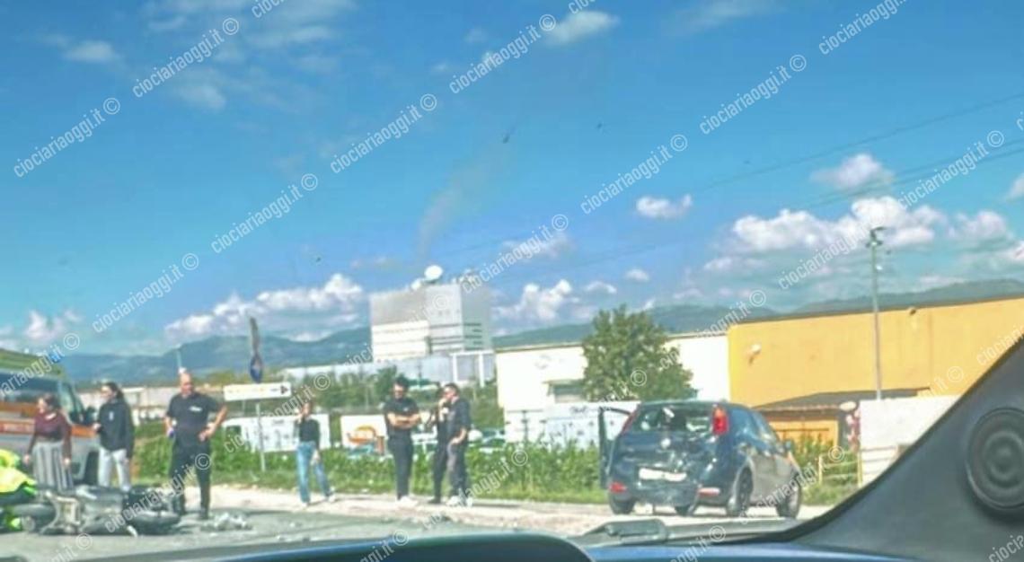 Scontro fra auto e moto lungo l'asse attrezzato a Frosinone. L'incidente si è verificato poco prima delle 14. Sul posto sono interventi un'ambulanza del 118 e le forze dell'ordine per i rilievi di rito per stabilire la dinamica. Inevitabili le ripercussioni sul traffico vericolare.