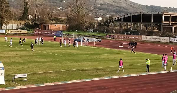 Nuovo passo verso il sogno. Il Cassino si accredita ancora di più nella corsa alla Serie C vincendo con un rotondo 3-0 sul Costa Orientale Sarda, il che gli consente di allungare in vetta (+3) approfittando del pareggio imposto dall’Atletico Uri al Gelbison. I biancazzurri vincono con merito, ma è stata una gara più scorbutica di quanto non racconti l’ultima posizione degli ospiti ed il risultato finale: il Cos approccia senza timore revenziale nei confronti della capolista, riuscendo a spuntare le armi ai benedettini per 45 minuti prima chela dea bendata dia una mano ai padroni di casa indirizzando la gara grazie all’autogol di Sulis. L’equilibrio persiste anche col Cassino in vantaggio venendo rotto definitivamente dal raddoppio di Abreu che chiude di fatto la contesa. Nel finale arrotonda il baby Carnevale, alla sua prima rete tra i grandi. Carcione rinuncia a Raucci e Lazazzera, squalificati, ripresentando il 3-4-3 dell’ultima sfida: dentro Croce in difesa, riecco Herrera in mediana, fuori Senesi e Carbone rispetto a domenica scorsa. In avanti chance dal primo minuto per Bellucci insieme a Valente ed Abreu. Pinna risponde con il 4-3-3 guidato in avanti da Loi, Pinna e Romano. Buon approccio del Costa Orientale Sarda che inizia il match in maniera sfrontata al cospetto della leader. Al 5’ sono proprio gli isolani a farsi vedere con Servegnini ilquale dallo spigolo destro dell’area lascia partire un mancino che, deviato, sfila largo rispetto ai pali di Stellato. La fase di studio dura lungamente ed il Cassino prova timidamente ad interromperla al 29’ con la punizione dal limite di Herrera che centra il nutrito muro di barriera eretto da Xaxa. Al 35’ con un gioco di prestigio Valente salta due avversari guadagnando il fondo sulla sinistra, il suo traversore rasoterra è spazzato proprio nei pressi della linea di porta da Rossi che anticipa Bellucci. Cresce il Cassino al 40’ con il promettente destro di Tribelli dal limite che viene deviato in angolo da difensore: sugli sviluppi del corner mischione davanti a Xaxa ma oltre al brivido non si va.I benedettini passano in vantaggio proprio nell’unico minuto di recupero: cross di prima intenzione di Maciariello che trova un intervento maldestro di Sulis ad infilare da centro area il proprio portiere con l’a i u to del palo. E’ un vantaggio pesantissimo per il Cassino. Nella ripresa gli uomini di Carcione approcciano in maniera veemente alla ricerca del raddoppio, ma sono quelli di Pinna a farsi vedere per due volte, seppur timidamente. Prima all’8’ con il colpo di testa di Pinna su calcio d’ang olo: Stellato si esibisce in una parata plastica; poi al 10’ con l’incursione per vie centrali di Loi che dai 25metri spara alto difettando di mira. Al 17 ’angolo di Herrera, flipper in area e sfera che schizza verso la porta, ma Xaxa è reattivo.Al 20’doppia gigantesca occasione per i padroni di casa: cross da destra di Tribelli per Abreu abile ad approfittare di uno scivolone di un difensore per presentarsi da solo davanti a Xaxa, il quale è bravissimo nel chiudergli lo specchio, respingendo, però, verso Valente che da non più di 8 metri, da posizione comoda,incredibilmente calcia alto. Per poco il Cosnon approfitta del gol sbagliato dal Cassino per pervenire al pari: Severgnini scaraventa al volo dai 25 metri abbondanti un destro che solo il balzo felino di Stellato impedisce il tramutarsi nel gol della domenica. Benedettini vicini al raddoppio al 29’ con il sinistro forte di Abreu, defilato a sinistra, che trova la grandissima risposta del sedicenne Xaxa ad inghiottire la sfera. Ma al 37’ si materializza il raddoppio benedettino: disimpegno sbagliato degli ospiti ad innescare un rapidissimo Abreu,abile nel lanciarsi nello spazio, presentandosi a tu per tu con Xaxa che in questo caso nulla può: 2-0 e “Salveti” ancora in festa. Si tratta della rete numero 13 in campionato per il portoghese. Gli ospiti vanno vicino ad accorciare le distanze con Enrico Loi, entrato da pochi minuti, il quale da centro area conclude rasoterra chiamando Stellato alla risposta di piede. In pieno recupero il Cassino cala il tris: contropiede condotto da Senesi bravo ad apparecchiare da destra radente erba per Carnevale che con un tocco delicato firma il3-0 sul palo lungo. Tutti sotto la “Laterale”... e il sogno continua.