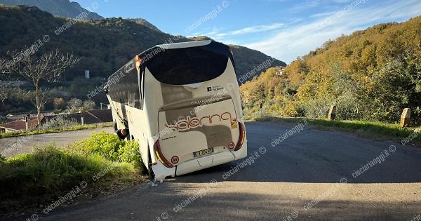 Paura sulla strada provinciale tra Ausonia e Castelnuovo. L'autista di un pullman gran turismo di una nota azienda di Cassino ha avuto un incidente, dopo aver lasciato i bambini della scuola di Castelnuovo Parano che aveva accompagnato ad uno spettacolo a Gaeta. La strada è bloccata in attesa che i soccorsi, i Vigili del Fuoco, effettuino le operazioni per liberare il mezzo pesante dal ciglio della strada. Sarà forse necessario l'utilizzo di una gru. Tanta paura per l'autista ma per fortuna nessun ferito.