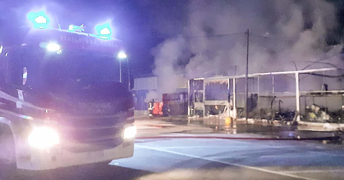 Erano le 23 circa quella sera, quando il fuoco ha carbonizzato la parte retrostante del capannone, dando origine a una colonna di fumo denso e irritante avvertito in gran parte della zona. Il tempestivo intervento delle squadre dei vigili del fuoco del comando provinciale ha fatto sì che le fiamme non si propagassero al resto del capannone invaso tuttavia interamente dal fumo il cui odore acre non sarà facile da smaltire. Hanno lavorato sodo per tutta la notte i pompieri e anche all’indomani mattina per lo spegnimento prima e per la bonifica e la messa in sicurezza del sito dopo.