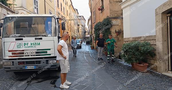 Il lavaggio delle strade questa mattina nel centro storico di Anagni