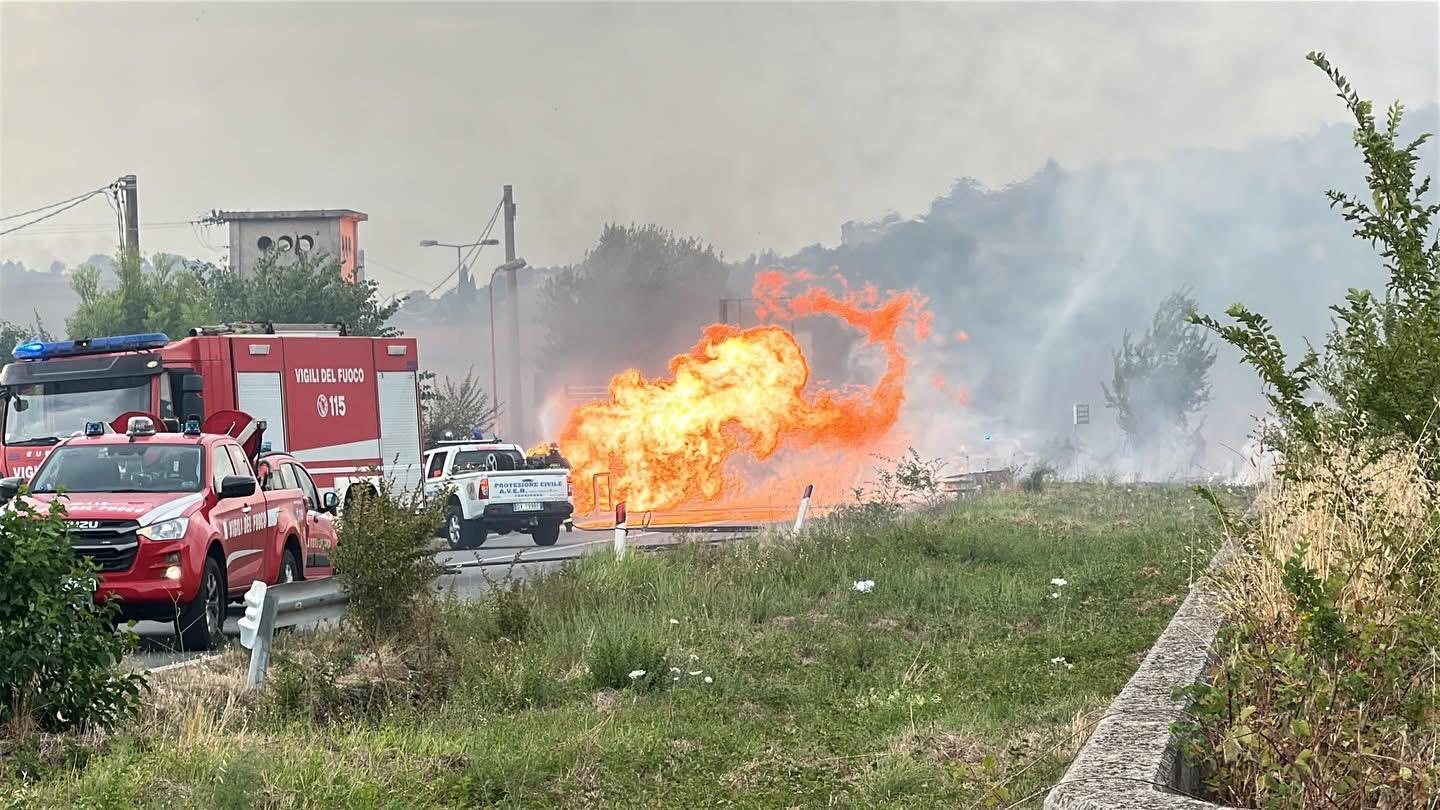 Incendio di sterpaglie sulla Casilina a Ferentino. È successo verso le 14 nei pressi di Orizzonte. Subito dopo le fiamme hanno interessato una condotta di gas che ha preso fuoco. Sul posto sono intervenuti i vigili del fuoco per domare il rogo, il nucleo forestale, la polizia locale e i carabinieri delle stazioni di Ferentino e di Morolo. A momenti dovrebbero arrivare i tecnici per interrompere l'erogazione del gas. Inevitabili le ripercussioni al traffico veicolare, il tratto di Casilina è stato chiuso e il traffico deviato su Fontana Olente.