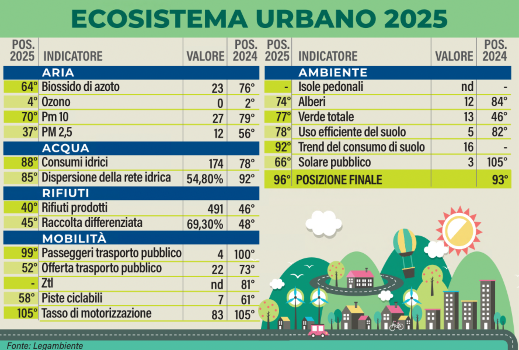 Rispetto a un anno fa migliorano, seppur di poco, i dati sull’inquinamento atmosferico, in modo particolare la media delle concentrazioni del Pm10 delle due centraline cittadine (tuttavia quella di via Verdi nel 2024 è risultata quarta in assoluto in Italia e prima tra i capoluoghi di provincia) e del Pm2,5 in viale Mazzini, un po’ di più per offerta del trasporto pubblico e, sensibilmente, degli impianti solari sugli edifici pubblici, leggero miglioramento per dispersione idrica, rifiuti prodotti e raccolta differenziata, praticamente stabile il valore per i passeggeri del trasporto pubblico (dal 100° al 99° posto), piste ciclabili (dal 61° al 58°), uso efficiente del suolo (dall’82° al 78°), fermi i dati sul tasso di motorizzazione, un’altra costante negativa del capoluogo. Si registra, inoltre, un grosso passo indietro sul verde pubblico.