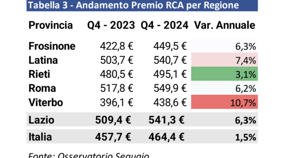 In particolare, dai risultati dell'osservatorio è emerso che le tariffe Rc auto hanno iniziato a stabilizzarsi in alcune regioni dopo due anni di aumenti. In testa attualmente il Molise, con un notevole decremento del 10,7%, seguito da Abruzzo (-2,5%), Sicilia (-2,2%), Calabria (-2,2%) e Marche (-1,3%). Brutte notizie invece per i guidatori del Lazio, dove nel quarto trimestre del 2024 si è registrato un rincaro dei costi dell'Rc auto pari al 6,3% rispetto allo stesso periodo dell'anno precedente. Una percentuale ben superiore rispetto alla media nazionale. Se nel quarto trimestre del 2023, infatti, il prezzo medio era di 509,40 euro, nell'ultimo trimestre del 2024 sono serviti in media 541,30 euro per assicurare un veicolo nel Lazio. Questo significa che i cittadini laziali hanno dovuto versare 31,90 euro in più rispetto all'ultimo trimestre del 2023.