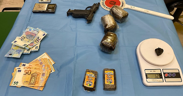 Durante la perquisizione domiciliare sono stati trovati cinque involucri di hashish, nascosti in un’intercapedine ricavata all’interno della cappa del camino della sua abitazione, per un peso complessivo superiore a un chilogrammo. I carabinieri hanno inoltre trovato una pistola scacciacani, denaro contante e due bilancini di precisione, utilizzati per il confezionamento delle singole dosi.