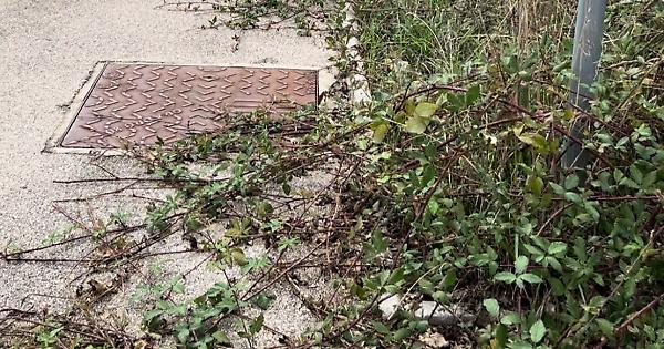 Rovi, sterpaglie e spine sul marciapiede di via Cesare Augusto Fanelli a Frosinone. Nella strada che costeggia l’ospedale Spaziani, per i pedoni è impossibile camminare: la banchina, infatti, è completamente invasa dalle erbacce che rendono difficile il passaggio a piedi.