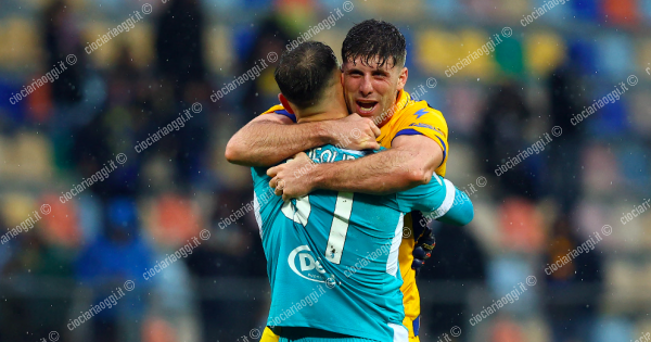 L'abbraccio tra il portiere del Frosinone Michele Cerofolini e il difensore Gabriele Bracaglia durante la partita contro il Mantova FOTO FEDERICO PROIETTI