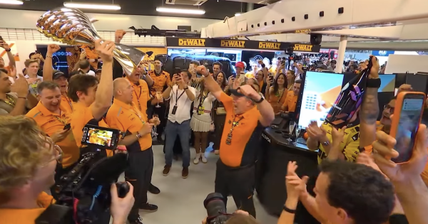 I festeggiamenti al box McLaren per la vittoria del titolo costruttori