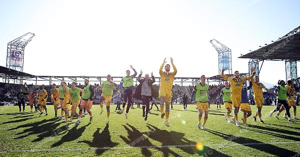 I giocatori del Frosinone esultano sotto la curva Nord dello "Stirpe" dopo la vittoria contro il Cagliari FOTO FEDERICO PROIETTI